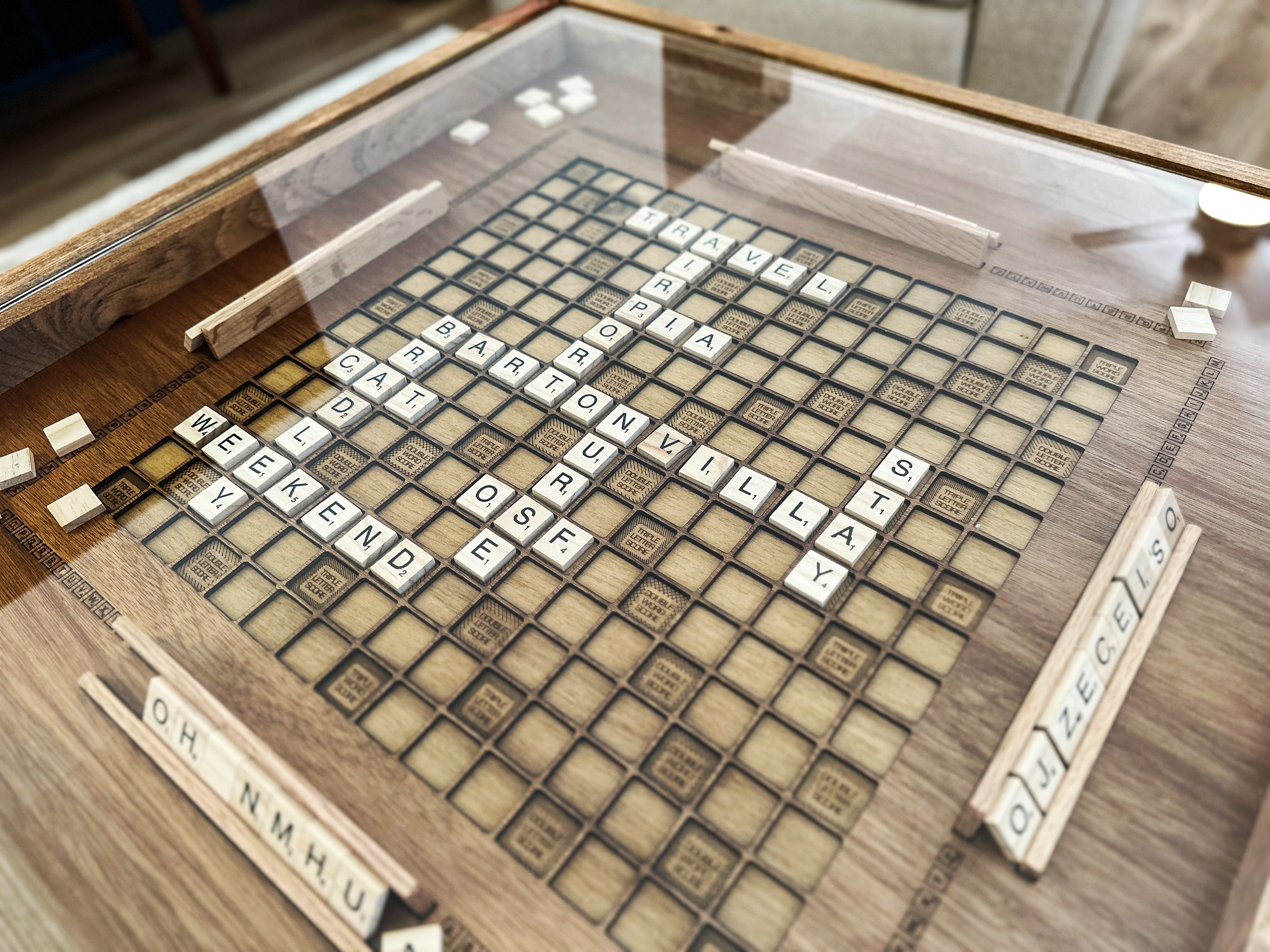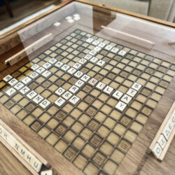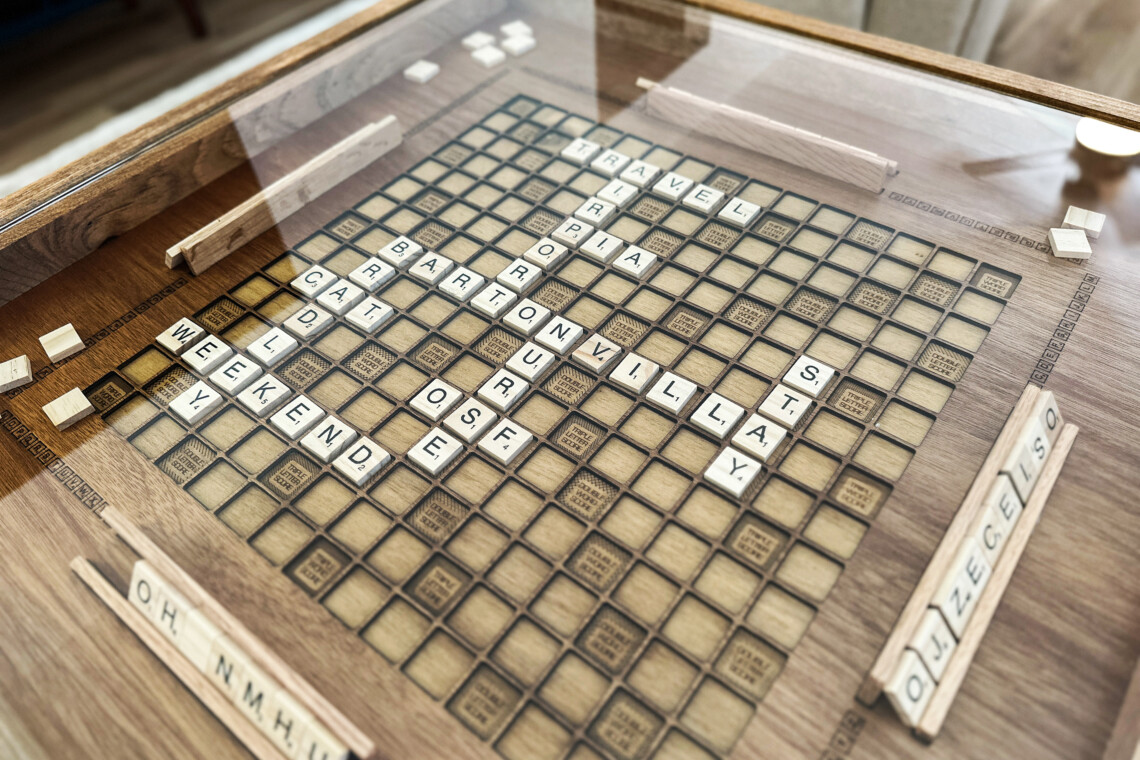 Scrabble coffee table with removable glass top for fun game nights.