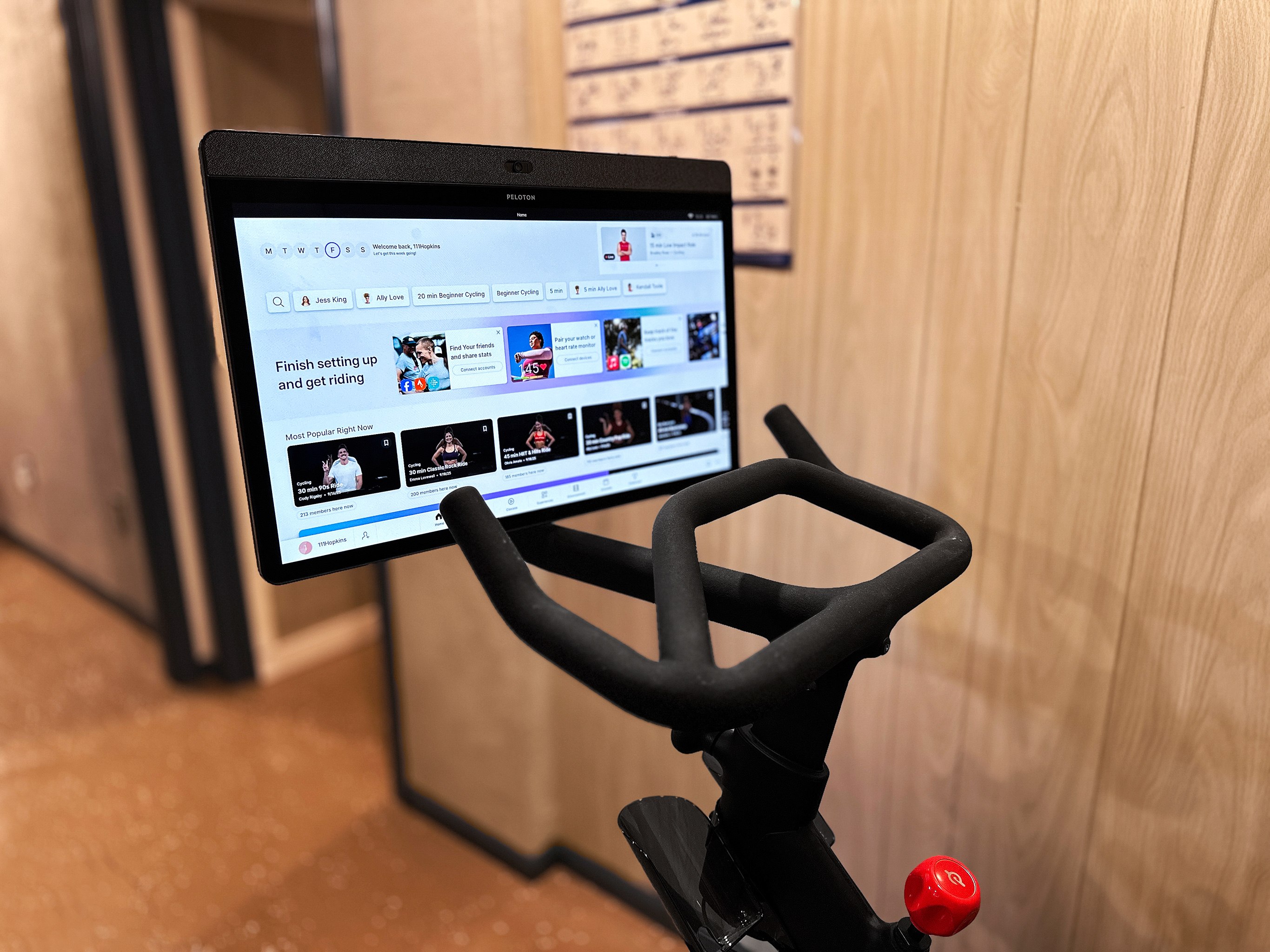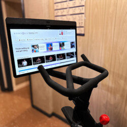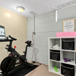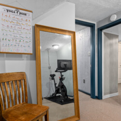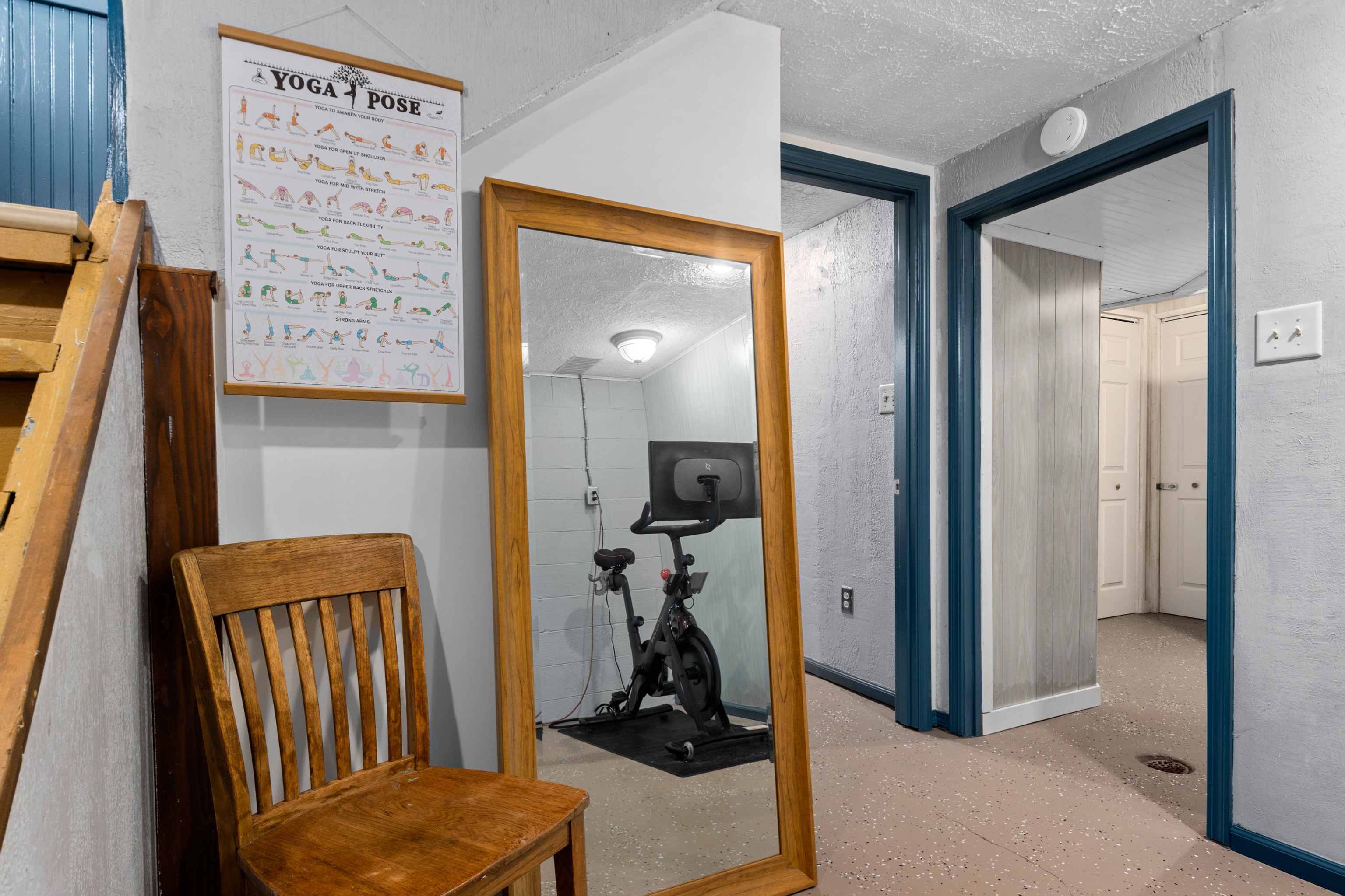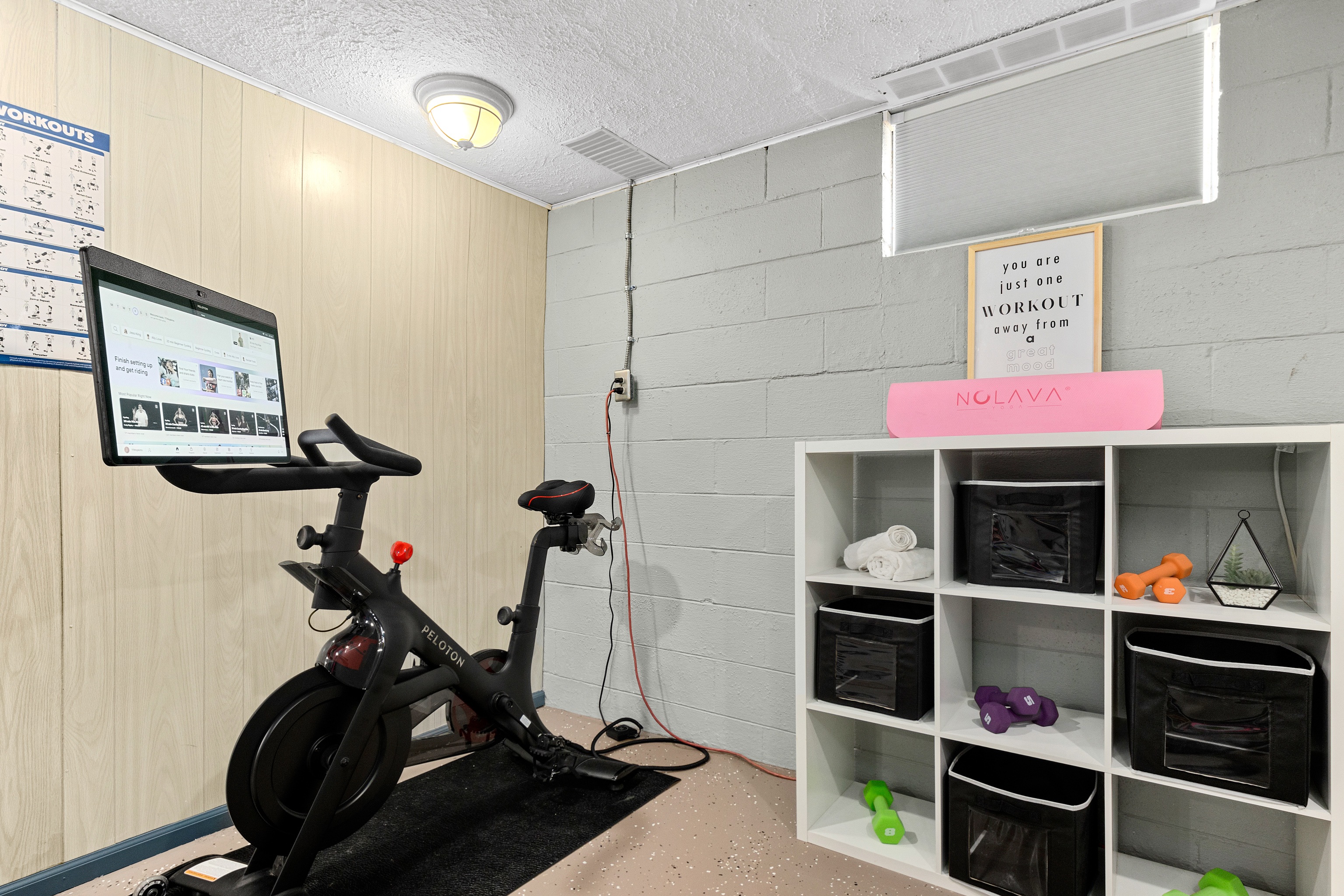 Exercise room featuring a Peloton bike with active subscription and rotating screen for yoga, strength, or other classes. (Shoe cages provided—no special shoes required!)