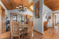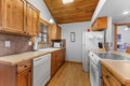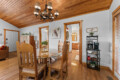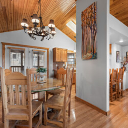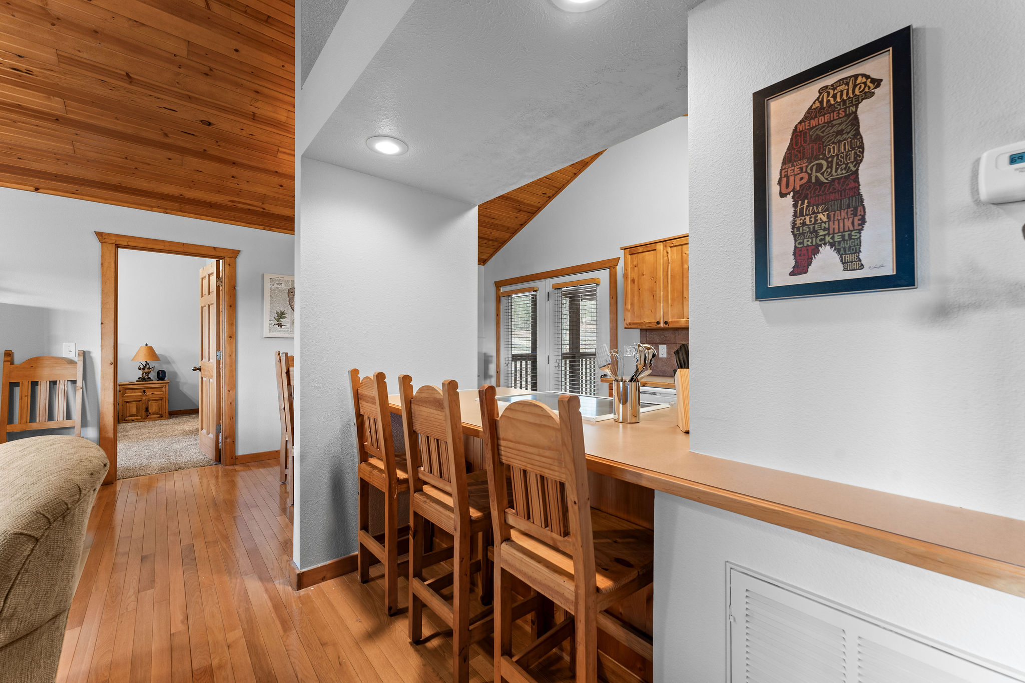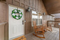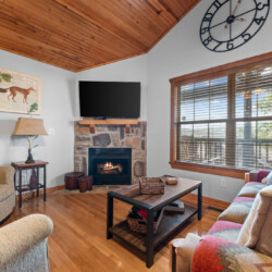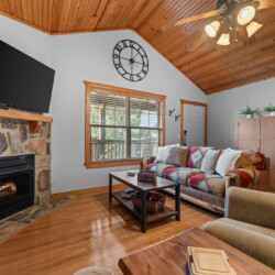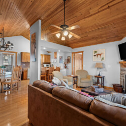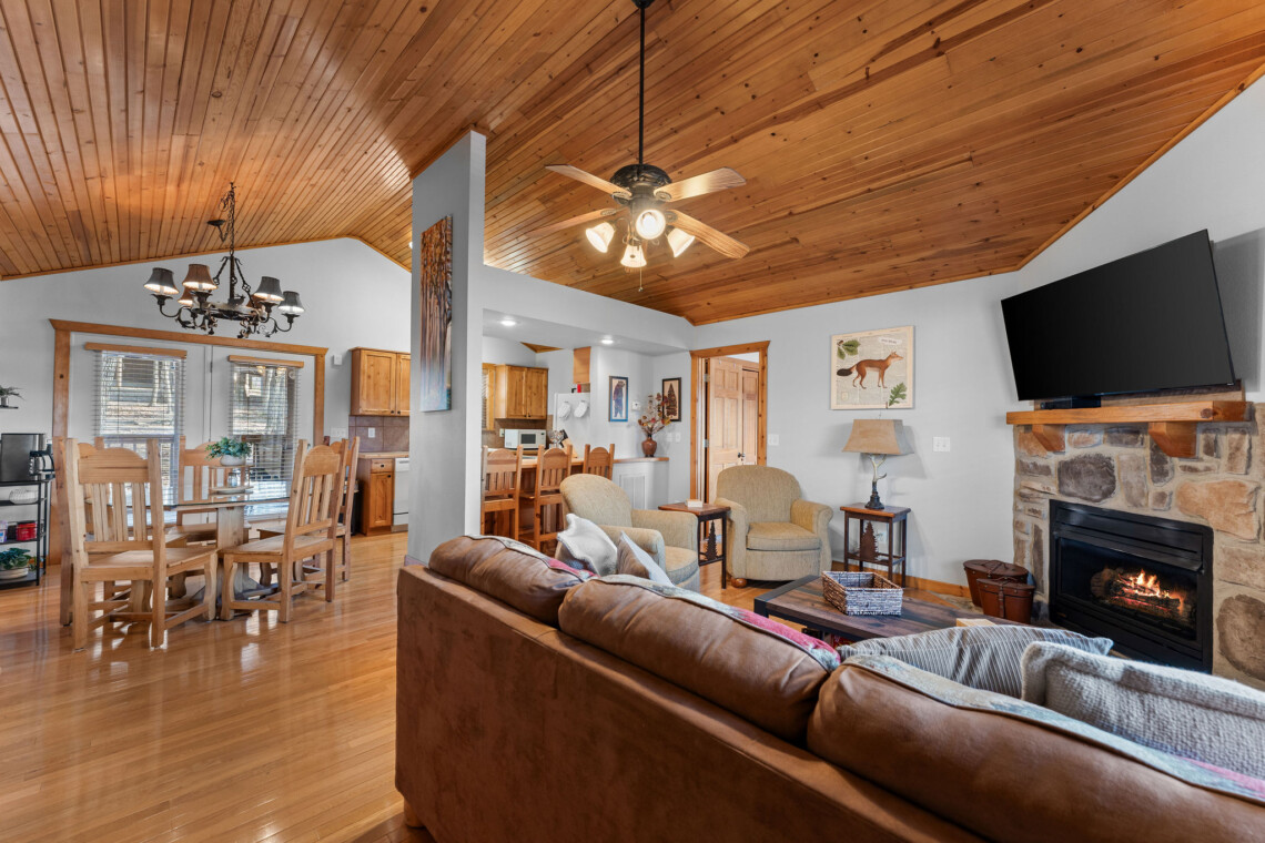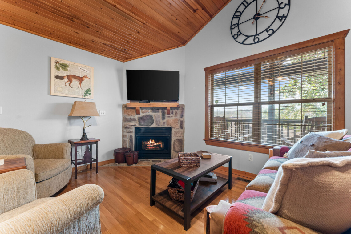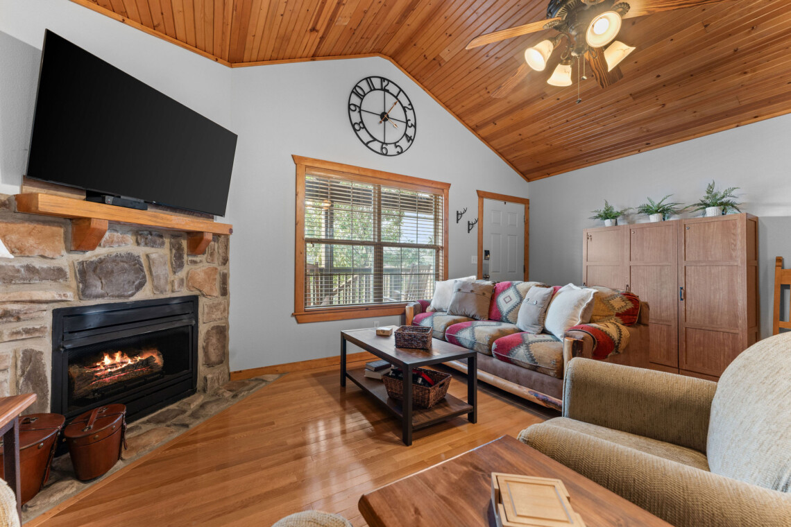 The cabin features a vaulted open living area. This spacious area features a 55 inch smart TV with cable, adequate seating for your group, and windows that fill the space with natural light. Lounge around a cozy fire while reminiscing about the activities of the day! From here, access a covered, deck with seating for 6.