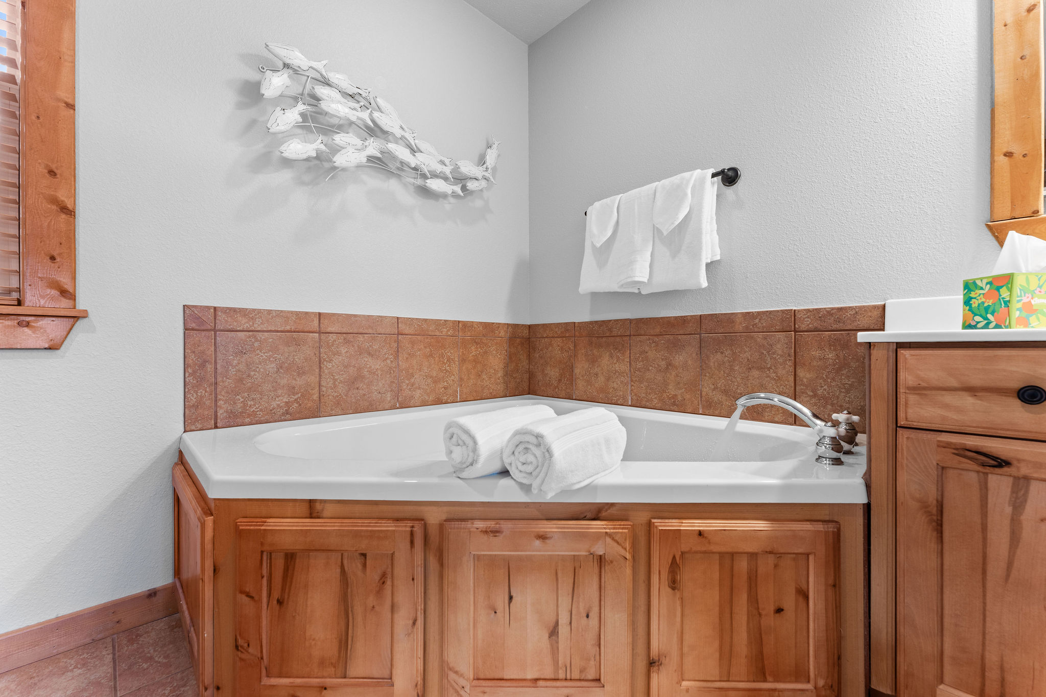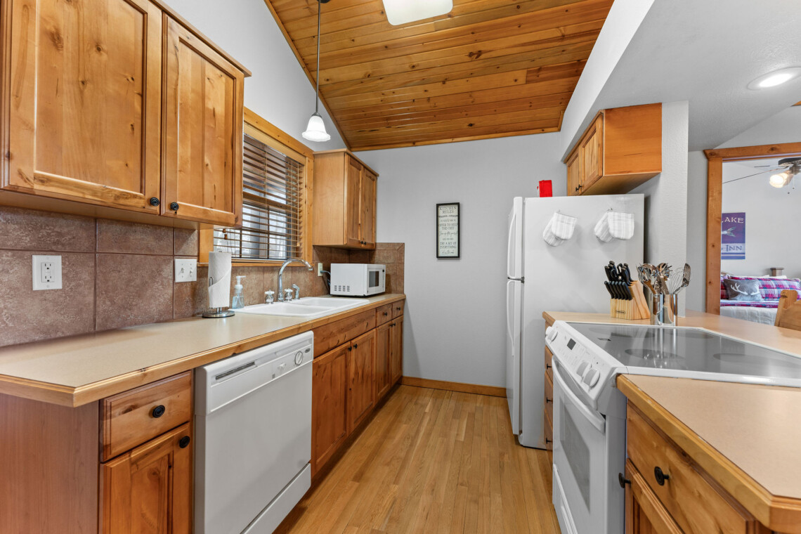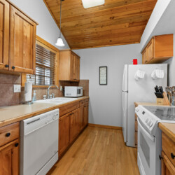 The kitchen is fully equipped and stocked, with all of the appliances and amenities you’d find at home, including a regular coffee maker, keurig coffee maker, and refrigerator with plenty of room for your vacation groceries.