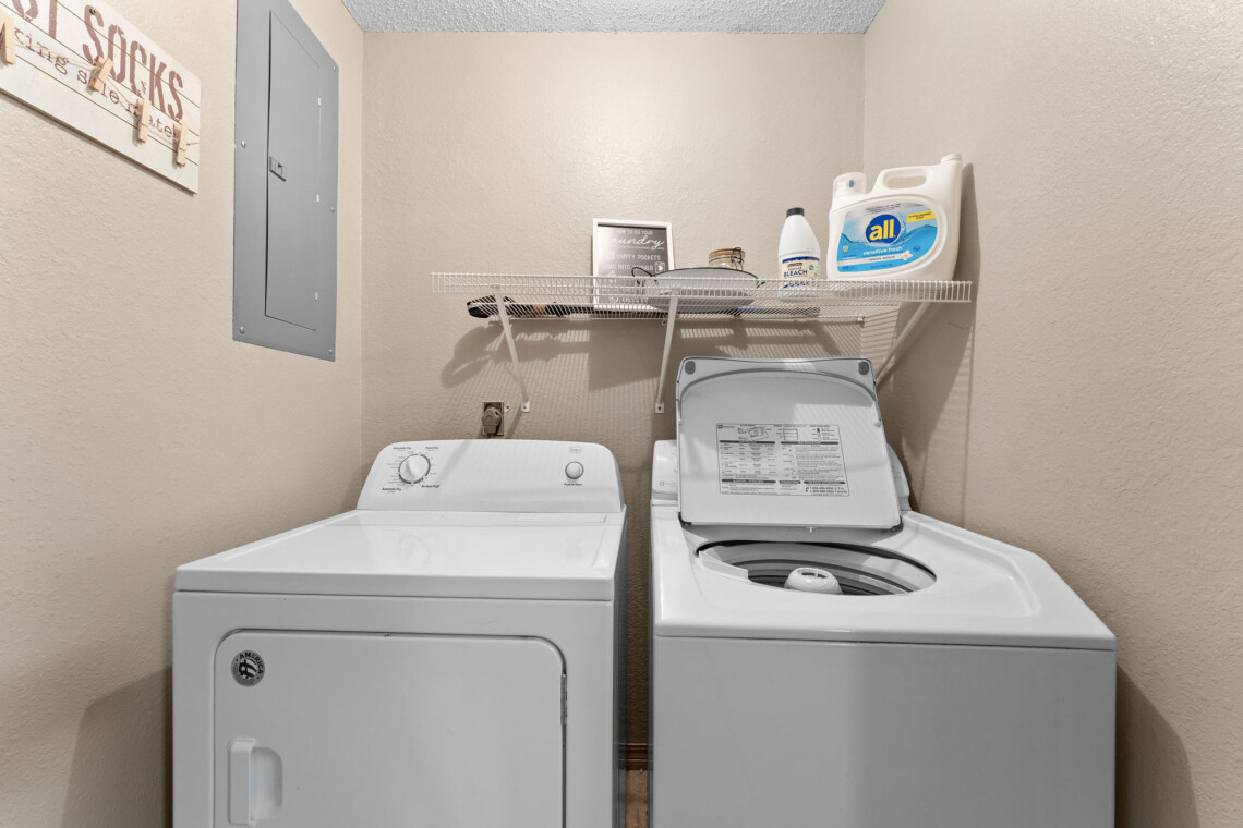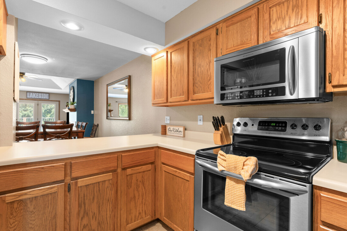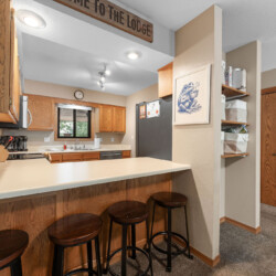 Fully stocked kitchen + dining for 8 at table and 4 more at kitchen bar