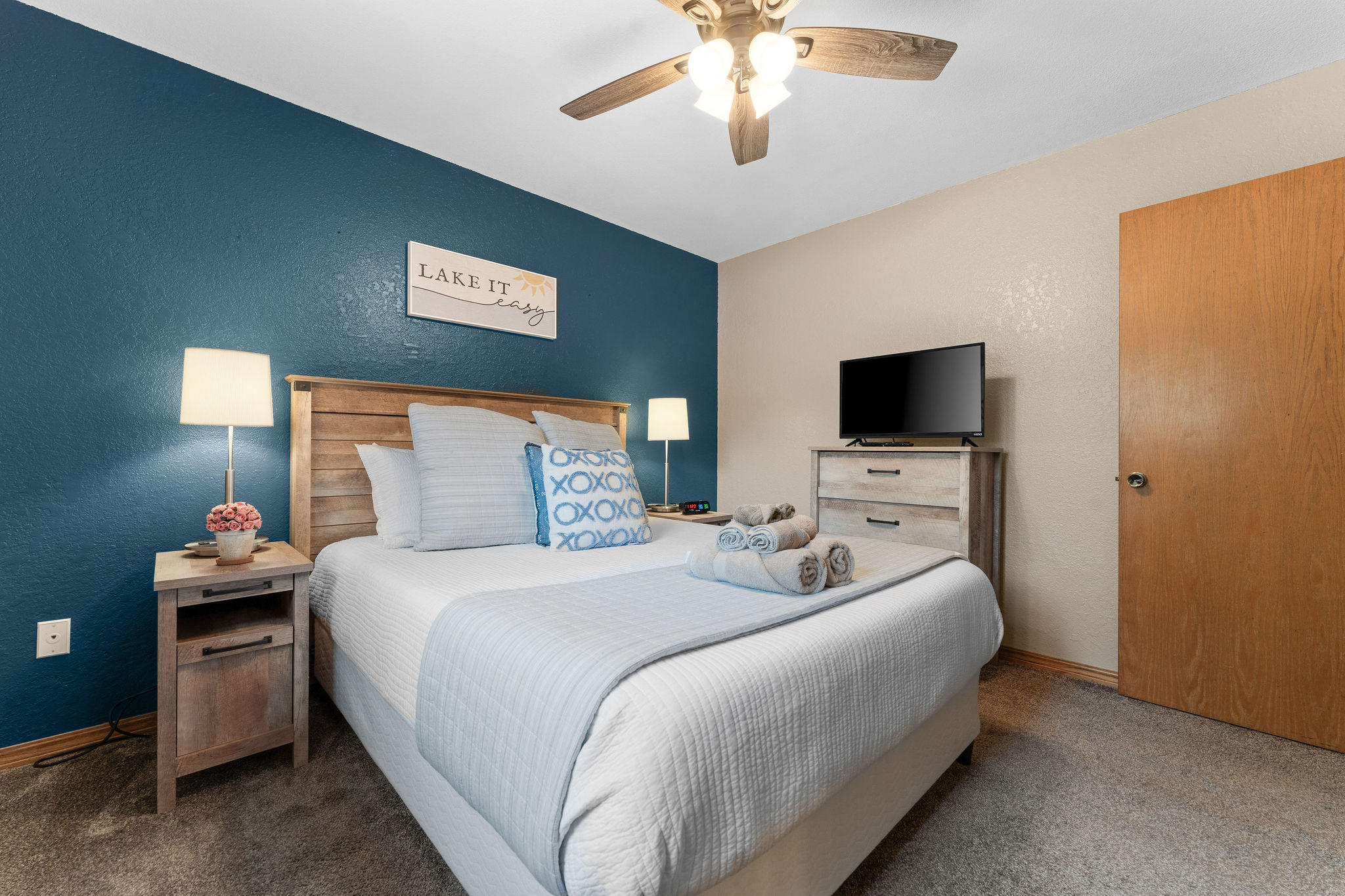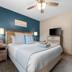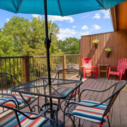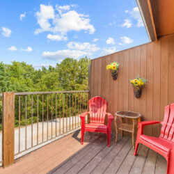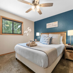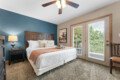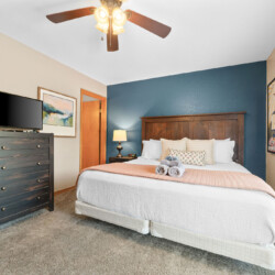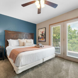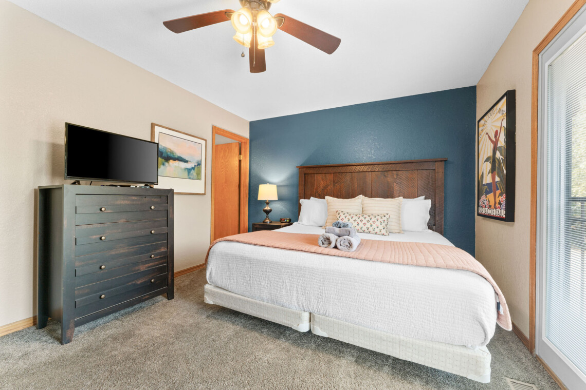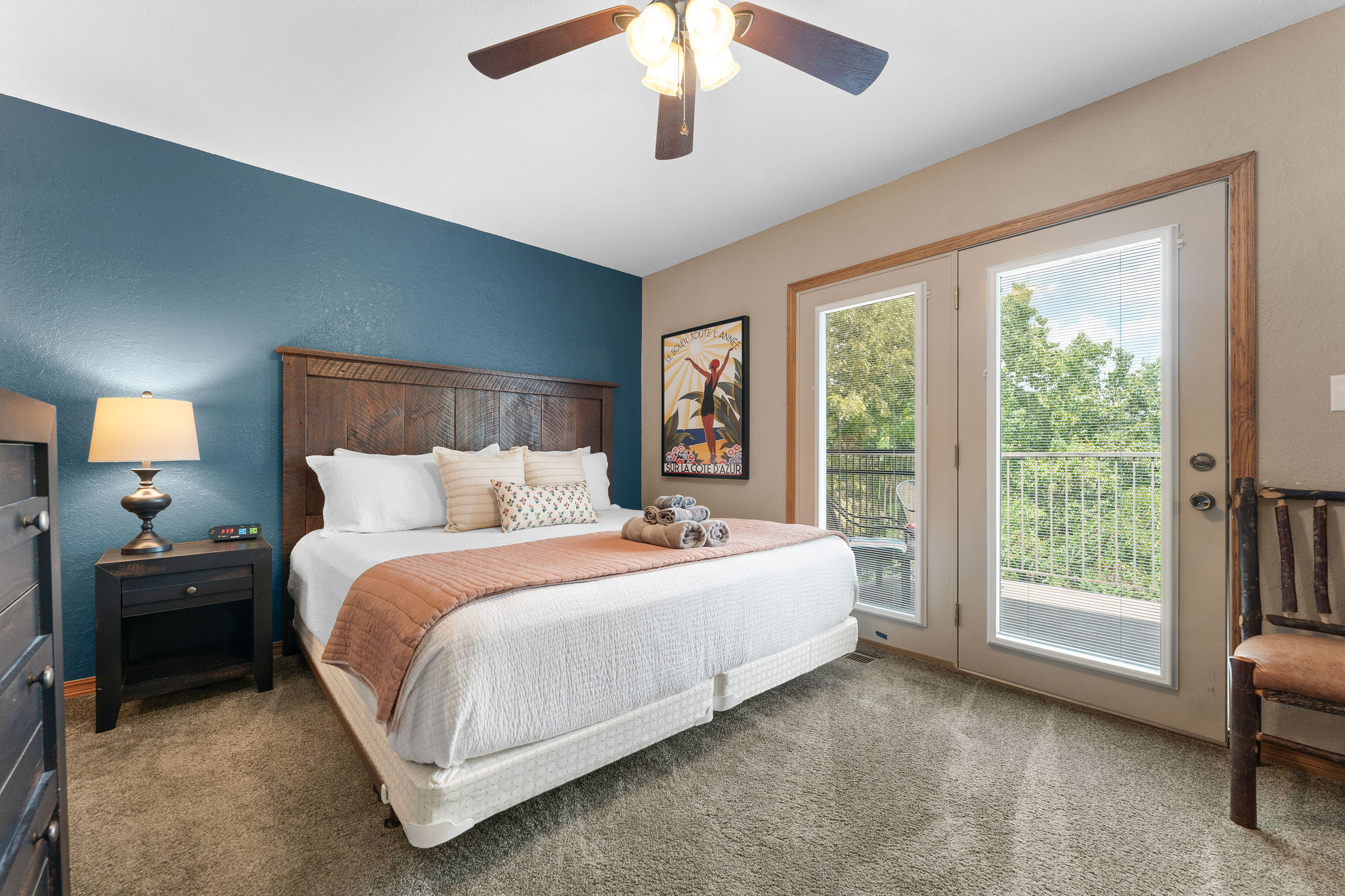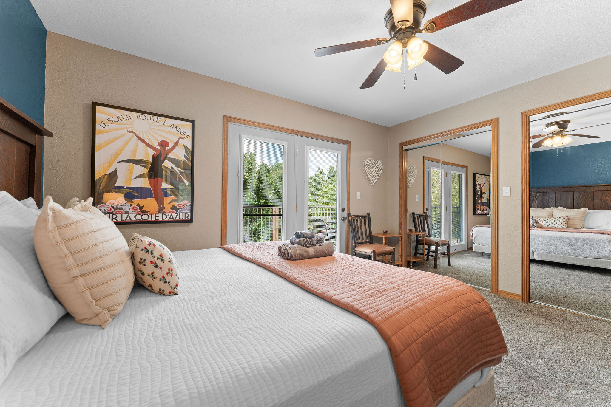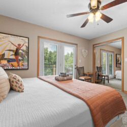 Primary Suite (Main Level): King bed + ensuite bath + deck access